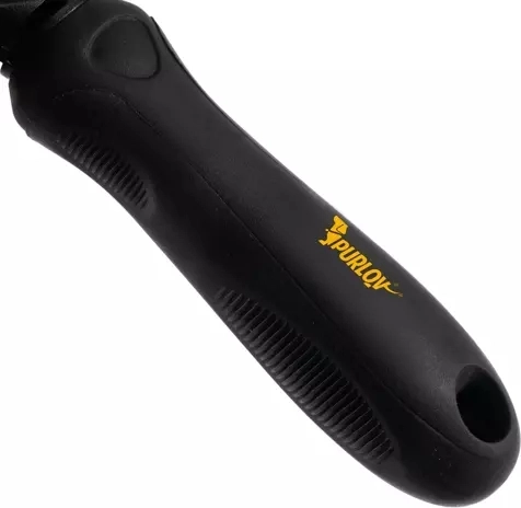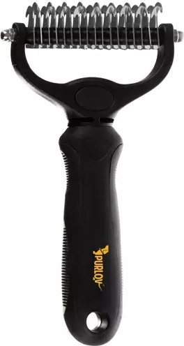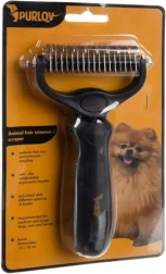 Uniwersalny, dwustronny trymer i zgrzebło do sierści PURLOV dla psów i kotów łączy stronę z 17 drobniejszymi zębami oraz stronę z 9 szerszymi zębami — do gęstego podszerstka i delikatnej sierści. Skutecznie ogranicza linienie, łatwo rozczesuje kołtuny i podszerstek, a dzięki ergonomicznej, antypoślizgowej rączce jest wygodny w użyciu. Zaokrąglone końcówki zębów są łagodne dla skóry.