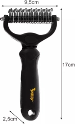 - Uniwersalne zastosowanie: jedna strona z 17 zębami (rozstaw 0,4 cm) do delikatniejszej sierści i wykończenia, druga z 9 zębami (rozstaw 0,8 cm) do gęstej i skołtunionej sierści.