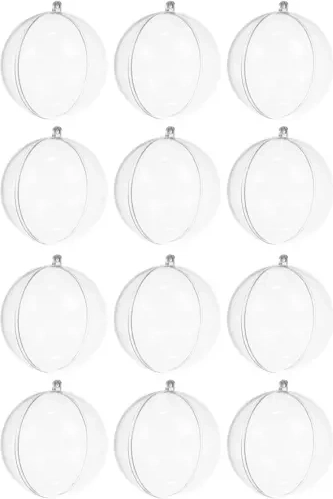 Przezroczyste rozkładane bombki świąteczne 8 cm w zestawie 12 szt. Nietłukące, idealne do DIY, malowania i wypełniania brokatem lub śniegiem. Sznureczki do zawieszenia w komplecie.