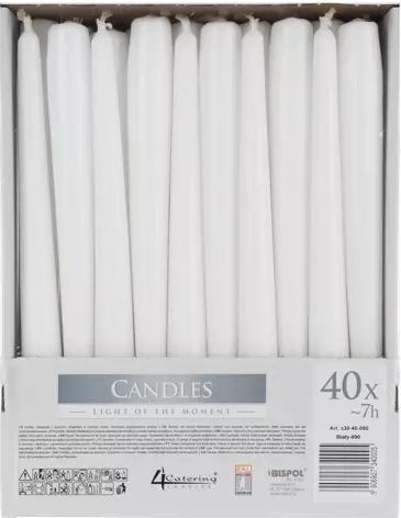 Eleganckie białe świece stożkowe na każdą okazję. Zestaw zawiera 40 sztuk o średnicy 2,3 cm i wysokości 24,5 cm, odpowiednie do świeczników i latarenek. Dzięki wysokiej jakości mieszance parafinowej oferują długi czas palenia do 7 godzin, czyste spalanie i ponadczasowy dekoracyjny wygląd na wesela, przyjęcia i do domowej atmosfery.