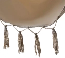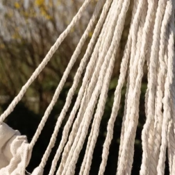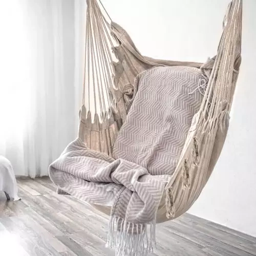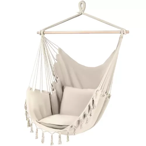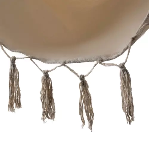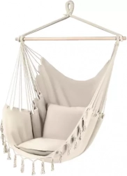 Montaż jest prosty dzięki solidnej pętli do zawieszenia i wytrzymałym linom, które równomiernie rozkładają obciążenie do 120 kg. W opakowaniu znajdziesz również 2 poduszki (40 × 40 cm) zapewniające miękkie podparcie pleców i głowy. Neutralny beżowy kolor doskonale komponuje się z naturalnymi materiałami i nowoczesnym stylem boho.