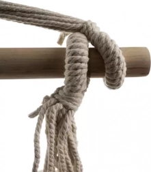 Mocno plecione liny i solidny górny pierścień równomiernie rozkładają ciężar. Drewniana belka utrzymuje fotel otwarty i stabilny.