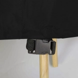 Pokrowiec wyposażono w dodatkowe elementy mocujące, takie jak dwa elastyczne paski z klamrami oraz dwa rzepy po bokach, które umożliwiają precyzyjne dopasowanie i zabezpieczenie przed wiatrem.