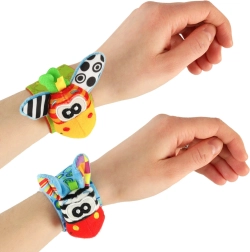 Urocze opaski ze zwierzątkami zainteresują maluszka kontrastowymi kolorami i wzorami, miękkim materiałem oraz różnymi fakturami dla zmysłu dotyku. Każdy ruch rączki nagradza delikatnym dźwiękiem grzechotki, a uszka dodatkowo kryją szeleszczące folie dla kolejnych wrażeń sensorycznych.