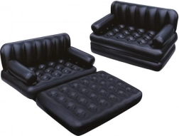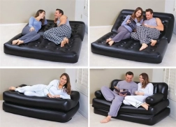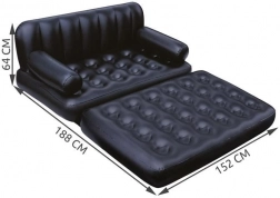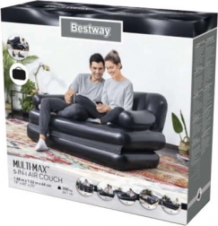 Praktyczna nadmuchiwana sofa 5w1 marki BESTWAY w kilka chwil zamienia się ze stabilnej kanapy w wygodne łóżko, leżankę albo wysoki materac jednoosobowy czy podwójny. Dzięki wytrzymałemu PVC, komfortowemu oparciu i podłokietnikom świetnie sprawdzi się w mieszkaniu, na działce i na kempingu. Jest wodoodporna, łatwa w czyszczeniu, a dzięki szybkozłącznemu dwukierunkowemu zaworowi łatwo ją nadmuchasz i spuścisz powietrze.