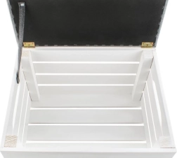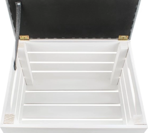 Uchylna pokrywa na zawiasach z paskiem odsłania duży schowek na koce, buty czy zabawki i pomaga utrzymać porządek w domu.