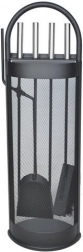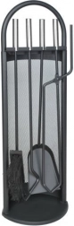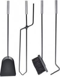 Wszystko pod ręką: szczypce, szufelka, szczotka, hak/poker oraz stabilny stojak do przejrzystego przechowywania i szybkiego dostępu podczas obsługi kominka.