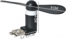 Praktyczny mini wiatraczek z podwójnym złączem 2w1 podłączysz bezpośrednio do telefonu microusb lub do standardowego portu usb (powerbank, laptop). Czerpie energię bezpośrednio z portu, więc nie potrzebuje baterii ani ładowania. Do użycia z telefonem wymagana jest funkcja OTG – przed zakupem prosimy ją sprawdzić. Wiatraczek nie działa przez redukcje ani przedłużające adaptery.