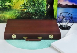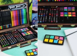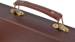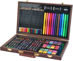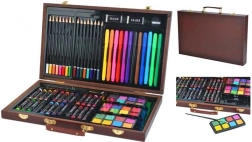 Wszystkie przybory plastyczne są schludnie ułożone w rozkładanej drewnianej walizce z przegródkami, dzięki czemu zawsze masz szybki i łatwy dostęp do wszystkiego, czego potrzebujesz.