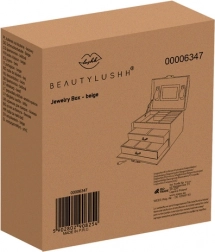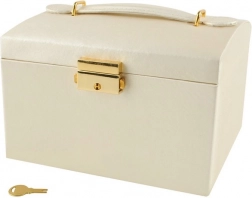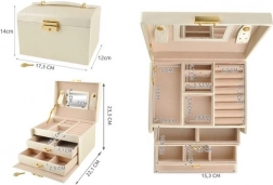 Elegancka szkatułka na biżuterię w beżowym kolorze z satynowym wykończeniem oferuje aż 20 przegródek, 2 szufladki oraz praktyczne wałeczki na pierścionki. Wewnątrz wieka znajduje się lusterko i paski z zapięciem na łańcuszki lub bransoletki. Dzięki zamykaniu na kluczyk Twoja biżuteria jest bezpieczna, a miękka wyściółka dodatkowo chroni przed zarysowaniami. Złote detale podkreślają ponadczasową elegancję, a szkatułka świetnie sprawdzi się zarówno w domu, jak i w podróży.