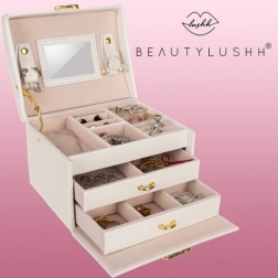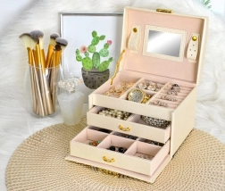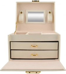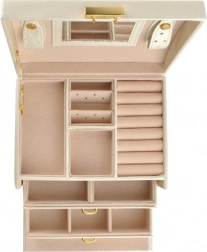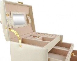 - Przejrzysta organizacja: 20 przegródek, wałeczki na pierścionki, 2 szufladki