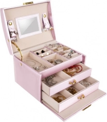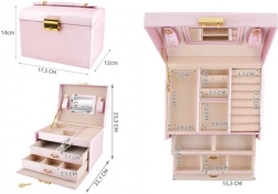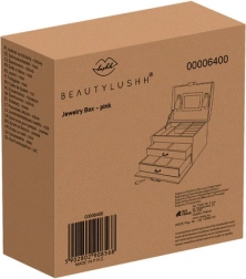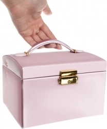 Wnętrze jest wyłożone delikatnym materiałem, który chroni biżuterię przed zarysowaniami. Metalowe elementy oraz pewne zamknięcie na klucz zapewniają poczucie bezpieczeństwa i elegancję. Praktyczne wałki stabilnie trzymają drobną biżuterię, a paski z zapięciem zapobiegają plątaniu łańcuszków. Wbudowane lusterko ułatwia szybkie dobranie dodatków przed wyjściem.