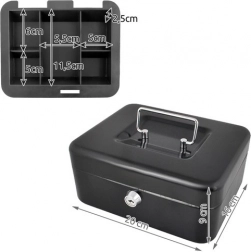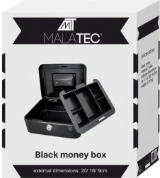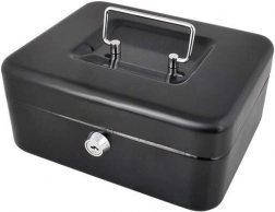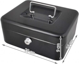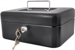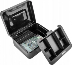 Praktyczna metalowa kasetka ISO TRADE w eleganckim czarnym kolorze bezpiecznie przechowa gotówkę i drobne kosztowności. Oferuje zamek na klucz, wyjmowaną tackę na monety z ukrytą przestrzenią pod nią oraz solidną metalową konstrukcję z wygodnym, składanym uchwytem. Kompaktowe wymiary 20 × 16 × 9 cm sprawdzą się w domu, biurze i pokoju hotelowym.