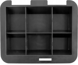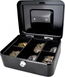 Pod wyjmowanym wkładem na monety znajduje się praktyczna, ukryta przestrzeń na banknoty, dokumenty lub inne cenne przedmioty. Dzięki przejrzystemu podziałowi przegródek drobne i banknoty będą zawsze pod ręką i szybko policzone – idealne do domu, biura i do recepcji.