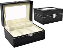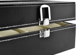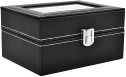 Uporządkuj i chroń swoje zegarki oraz biżuterię w eleganckim pudełku, które łączy premium wygląd i praktyczną ochronę. Czarna ekoskóra z kontrastowym białym przeszyciem wygląda ponadczasowo, a szklane wieko zapewnia natychmiastowy podgląd i efektowną ekspozycję zawartości.