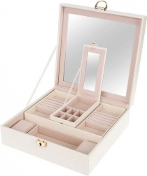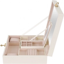 Lustro wewnętrzne szkatułki ułatwia nakładanie biżuterii lub makijażu. Pod lustrem znajduje się przestrzeń do przechowywania najcenniejszych przedmiotów.