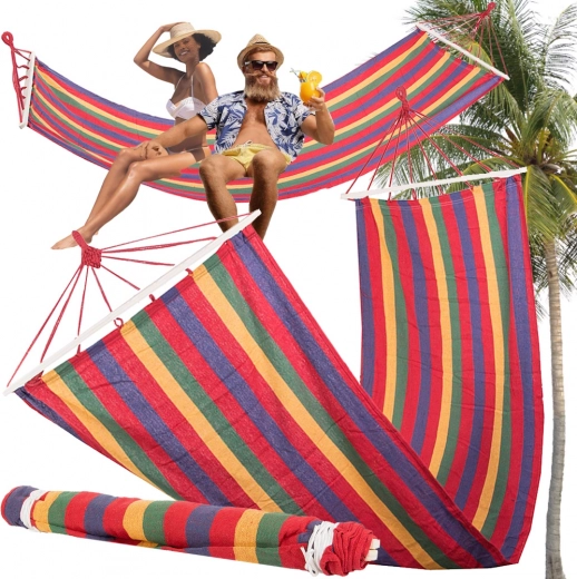 Zrelaksuj się na świeżym powietrzu z tym pasiastym hamakiem z drewnianymi poprzeczkami. Oferuje szeroką powierzchnię 200 × 80 cm, stabilny rozkład dzięki drążkom dystansowym oraz udźwig do 150 kg. Wytrzymała mieszanka bawełny i poliestru jest oddychająca, przyjemna w dotyku i łatwa w pielęgnacji. Szybki montaż, niska waga i stylowy, wielokolorowy design sprawiają, że to idealny wybór do ogrodu, na taras, balkon i na kemping.