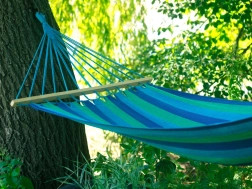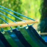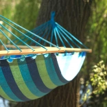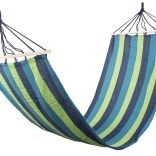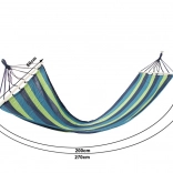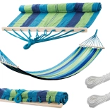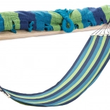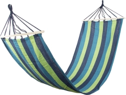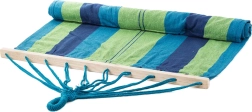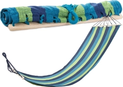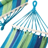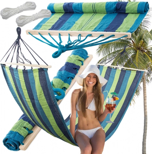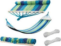 Ten ogrodowy hamak z drewnianymi drążkami rozporowymi jest idealny do wypoczynku na zewnątrz i w domu. Wytrzymała mieszanka bawełny i poliestru jest przyjemna w dotyku, przewiewna, a jednocześnie solidna. Dzięki mocnym plecionym linom i stabilnej konstrukcji zapewnia bezpieczne i komfortowe bujanie.