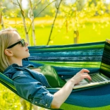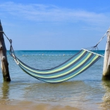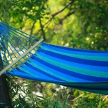 W zestawie znajdują się sznury montażowe, więc instalacja zajmuje chwilę — między drzewami, na stelażu lub na specjalnych uchwytach. Hamak łatwo przenosić, zajmuje mało miejsca i można go prać w pralce, dlatego świetnie sprawdzi się w ogrodzie, na tarasie, balkonie i na kempingu.