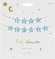 Stylowy baner na baby shower z motywem gwiazdek i napisem „Baby Shower” w delikatnym jasnoniebieskim kolorze. Idealny do dekoracji dla przyszłej mamy, łatwy do zawieszenia i tworzy natychmiastową, uroczystą atmosferę. Długość sznurka ok. 3 m, wymiary baneru 290 × 16,5 cm.