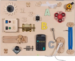 Ta drewniana manipulacyjna tablica jest pełna różnorodnych elementów do zabawy, które pomagają dzieciom rozwijać ich umiejętności. Dzieci mogą bawić się różnymi interaktywnymi mechanizmami, które zapewnią rozrywkę na długie godziny.
