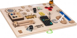 Zawiera różne elementy jak zamki, karuzela i kalkulator, które rozwijają małą motorykę i zdolności poznawcze.