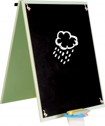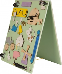 Jedna strona tablicy wyposażona jest w elementy poznawcze i dotykowe, podczas gdy druga służy jako powierzchnia do rysowania kredą.