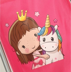 Różowy materiał z grafiką dziewczynki z jednorożcem nadaje bajkowy wygląd, który dzieci uwielbiają.