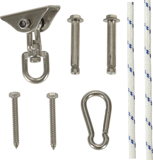 - Kompletny zestaw: obrotowy hak, karabińczyk, lina, 2 wkręty do drewna i 2 kotwy rozporowe do betonu.
