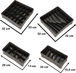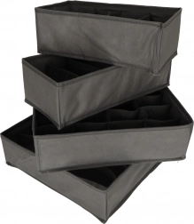 Zaprowadź porządek w szufladach w mgnieniu oka. Ten zestaw 4 tekstylnych organizerów z różną liczbą przegródek przejrzyście posegreguje skarpetki, bieliznę, biustonosze oraz akcesoria. Dzięki miękkiemu, a jednocześnie usztywnionemu materiałowi trzymają formę, są łatwe do czyszczenia, a w razie potrzeby można je po prostu złożyć na płasko i odłożyć.