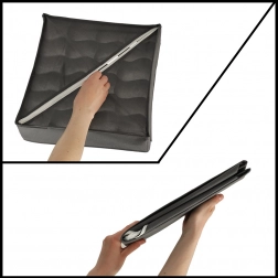 Wzmocnione ścianki trzymają kształt, a elastyczne przegrody dopasowują się do zawartości. Oddychająca włóknina zapewnia cyrkulację powietrza i łatwą pielęgnację. Gdy nie potrzebujesz organizera, po prostu złóż go na płasko i odłóż.