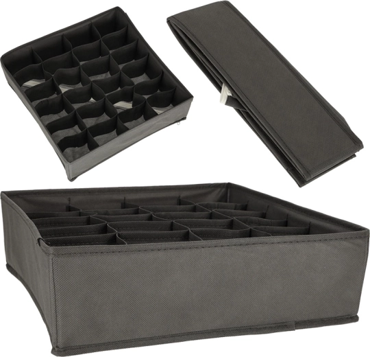 Zrób porządek w szufladzie raz na zawsze. Ten tekstylny organizer z 24 przegródkami przejrzyście posegreguje skarpetki, bieliznę, krawaty i akcesoria. Ma wzmocnione ścianki, jest z oddychającej tkaniny, łatwo się czyści, a dzięki składanej konstrukcji nie zajmuje miejsca, gdy akurat go nie potrzebujesz.