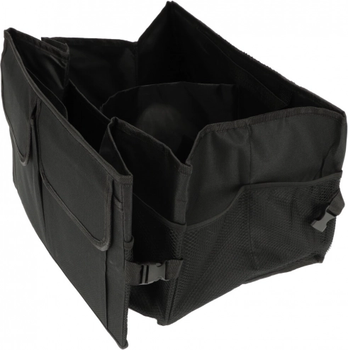 Utrzymuj porządek w bagażniku bez wysiłku. Ten przestronny, składany organizer z wytrzymałego poliestru oferuje trzy główne przegrody, boczne kieszenie z klapą oraz cztery kieszonki z siatki na drobiazgi. Dzięki solidnej konstrukcji, praktycznym uchwytom i możliwości szybkiego złożenia na płasko jest idealny na zakupy, narzędzia i kosmetyki samochodowe.