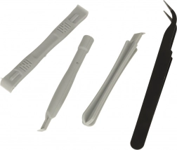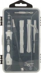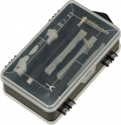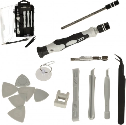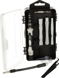 Rękojeść, adaptery, otwieraki, pęseta, przyssawka, kluczyk do SIM oraz magnetyzer/demagnetyzer – wszystko, czego potrzeba do bezpiecznego demontażu i napraw.