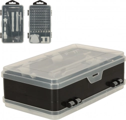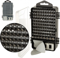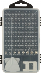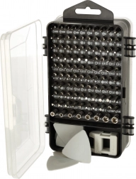 W zestawie znajduje się 96 różnych bitów (Torx, Torx z otworem, Hex, płaskie, Phillips, PZ, Square, trójkątne, pentalobe, microstix, nasadki i inne), elastyczna przedłużka do trudno dostępnych miejsc, narzędzia do otwierania, przyssawka, pęseta oraz magnetyzer/demagnetyzer dla lepszego trzymania śrubek. Dwustronne etui z opisanymi pozycjami zapewnia przejrzyste przechowywanie i szybkie odnajdywanie właściwego elementu.