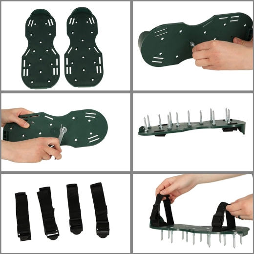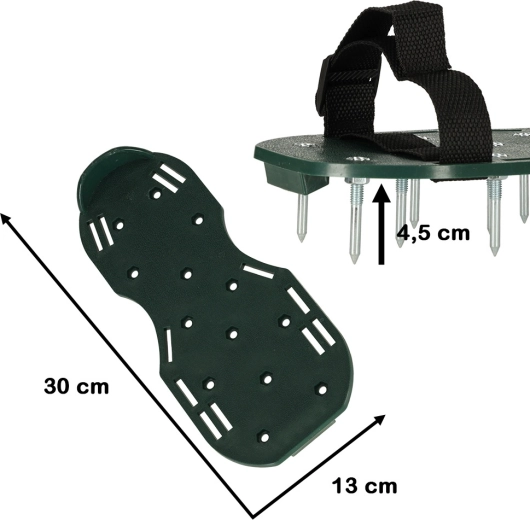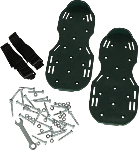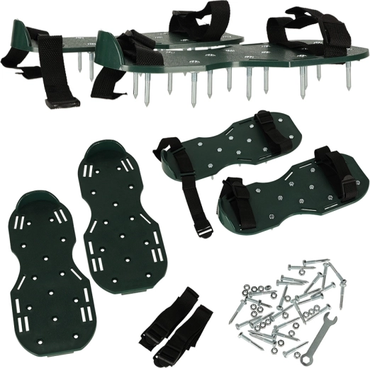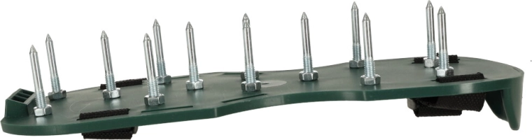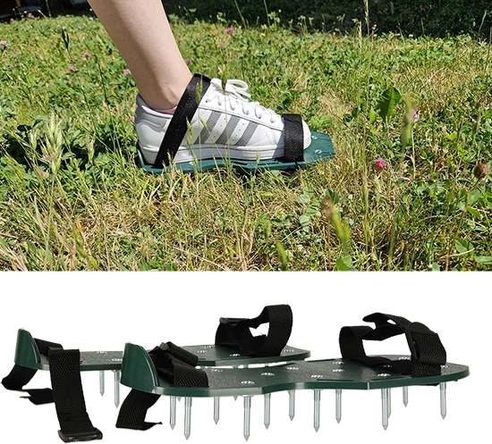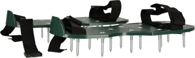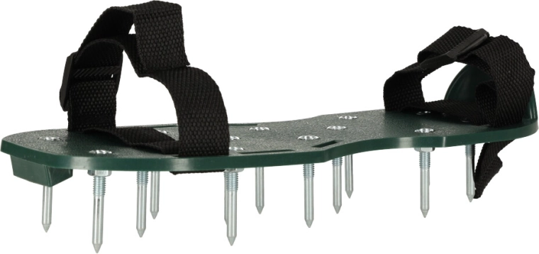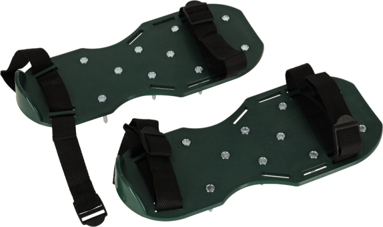 Prosty sposób na uzyskanie pięknie zielonego i odpornego trawnika. Zakładasz buty z kolcami na swoje robocze obuwie, dociągasz cztery regulowane paski i po prostu spacerujesz po ogrodzie. Napowietrzanie trawnika poprawia wsiąkanie wody, zmniejsza zagęszczenie gleby i skutecznie wspiera działanie nawozów.