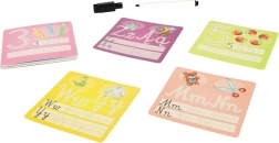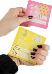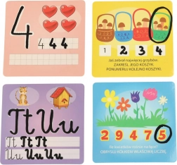 Kolorowe karty prowadzą dzieci krok po kroku do rozpoznawania i pisania liczb 1–12 oraz wielkich i małych liter.