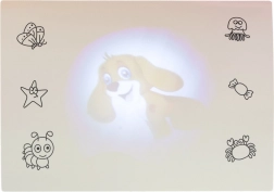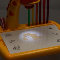 Ten uroczy projektor stołowy w kształcie żyrafy uatrakcyjni każde tworzenie. Po włożeniu jednego z trzech krążków z obrazkami i włączeniu projekcji na powierzchni pojawi się motyw, który dzieci łatwo odrysują. Dzięki zmazywalnej podkładce mogą próbować wciąż od nowa – bez marnowania papieru.