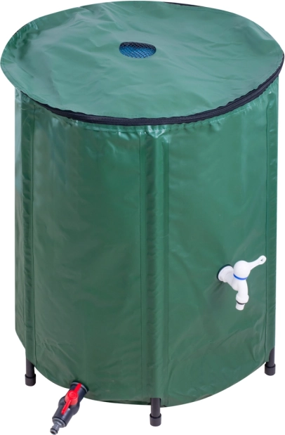 Oszczędzaj wodę i pieniądze dzięki praktycznemu zbiornikowi na deszczówkę o pojemności 200 l. Zielone wykończenie naturalnie wtapia się w otoczenie ogrodu, a wysokiej jakości materiał PVC jest odporny na warunki pogodowe i gwarantuje długą żywotność bez przecieków. Dzięki składanej konstrukcji poza sezonem łatwo go złożysz i schowasz.