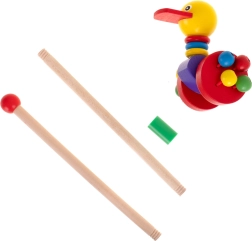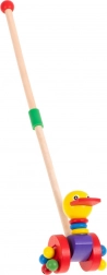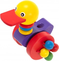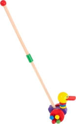 Ta kolorowa drewniana kaczuszka to idealna towarzyszka spacerów. Została zaprojektowana tak, aby wspierać dziecięcą motorykę i ruch. Dzięki łatwemu w obsłudze drewnianemu kijowi, kaczuszka może być prowadzona lub dzieci mogą się nią bawić samodzielnie.