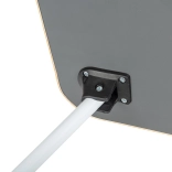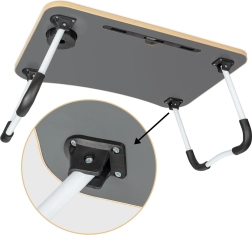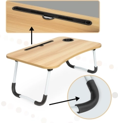 Stół jest wyposażony w slot na tablet lub telefon oraz otwór na kable, co zwiększa jego praktyczność. Jeśli szukasz doskonałego pomocnika do wygodnej pracy z dowolnego miejsca, ten składany stół na notebooka jest właściwym wyborem.