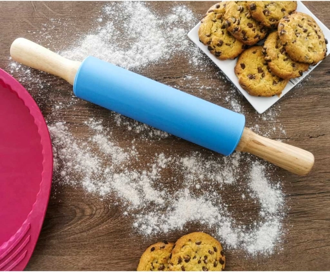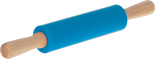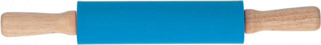 Połączenie niebieskiego silikonu i drewna nadaje wałkowi atrakcyjny wygląd, który pasuje do każdej kuchni.