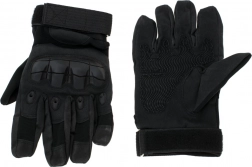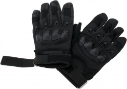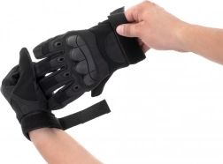 Te czarne taktyczne rękawice zostały zaprojektowane do wymagających warunków. Warstwowe wzmocnienia na dłoni poprawiają pewność chwytu i chronią najbardziej narażone miejsca przed przetarciem lub przecięciem. Twarde wypełnienie na grzbiecie dłoni chroni kostki przed uderzeniami, a regulowany pasek na nadgarstku zapewnia stabilne i bezpieczne osadzenie bez nieprzyjemnego przesuwania.