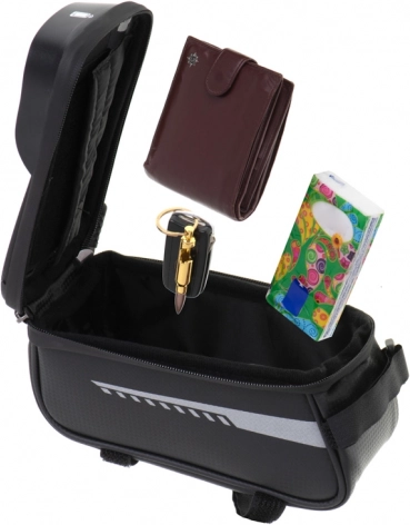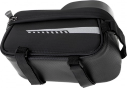 Jej kompaktowe wymiary nie będą przeszkadzać podczas jazdy. Kieszeń zapinana jest na zamek, co zapewnia, że nic nie wypadnie, nawet w ostrych zakrętach. Montaż torby jest zapewniony trzema rzepami: jednym na kierownicę i dwoma na ramę roweru, co gwarantuje doskonałą stabilność podczas jazdy. Pasuje na każdy model roweru bez względu na markę.