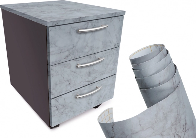 Odśwież wygląd mebli, parapetów i ścian za pomocą samoprzylepnej folii dekoracyjnej w wzorze szarego marmuru. Rola 1,22 × 50 m łatwo się aplikuje dzięki klejowi z kanalikami – bez pęcherzyków, jest termoplastyczna i plastyczna, wodoodporna i odporna na ścieranie, ma siatkę do precyzyjnego cięcia i można ją łatwo usunąć bez pozostałości.
