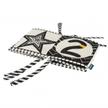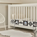 Ta edukacyjna tekstylna książeczka to świetny dodatek do dziecięcego pokoju. Działa nie tylko jako książeczka pełna kontrastowych wzorów do stymulacji wzrokowej, ale także jako ochronny panel do łóżeczka.