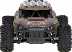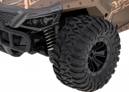 Samochód jest wyposażony w duże gumowe opony z bieżnikiem i solidnym podwoziem, które pozwalają pokonywać trudne tereny.