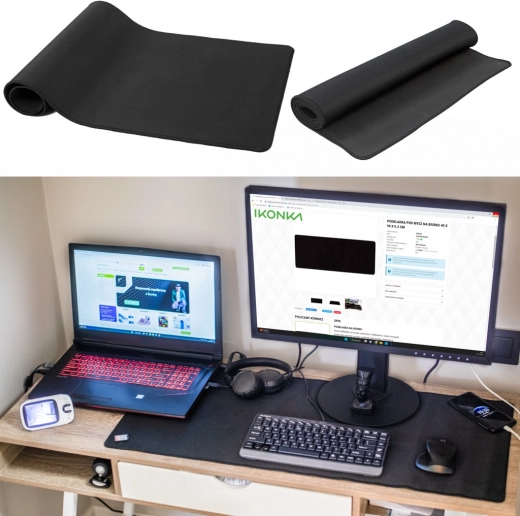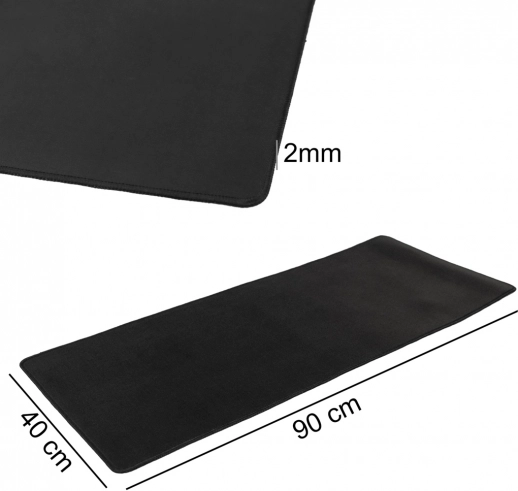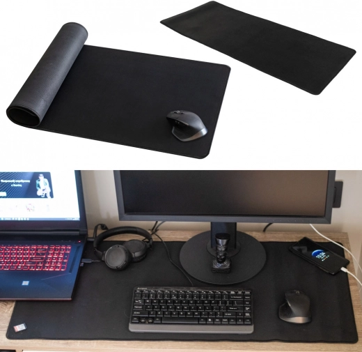 Duża czarna podkładka pod mysz i klawiaturę, idealna do płynnego ruchu myszy i ochrony biurka.
