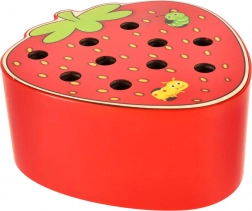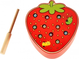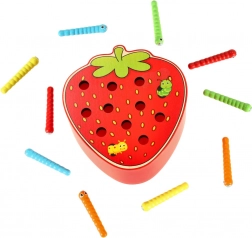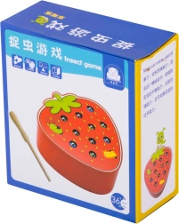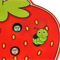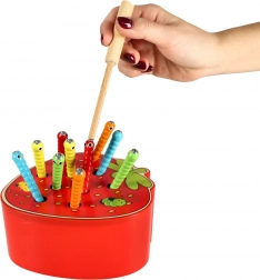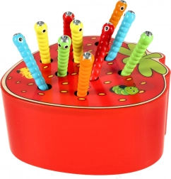 Ta magnetyczna gra w kształcie truskawki zajmie dzieci na długie godziny. W korpusie truskawki ukryto 10 kolorowych gąsienic z metalowym zakończeniem, które dziecko łapie i wyciąga za pomocą drewnianej pałeczki z magnesem. Trudniejsza wersja polega na tym, aby po złapaniu precyzyjnie odkładać gąsienice na ich miejsce.