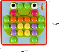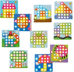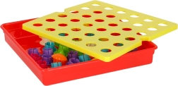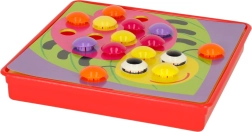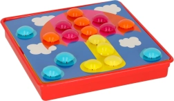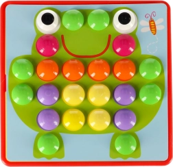 Duże kołeczki łatwo się chwyta, a dzieci wkładają je w otwory według kolorów – ćwiczą chwyt, koordynację oko–ręka i uwagę. Idealna pierwsza mozaika dla przedszkolaków.